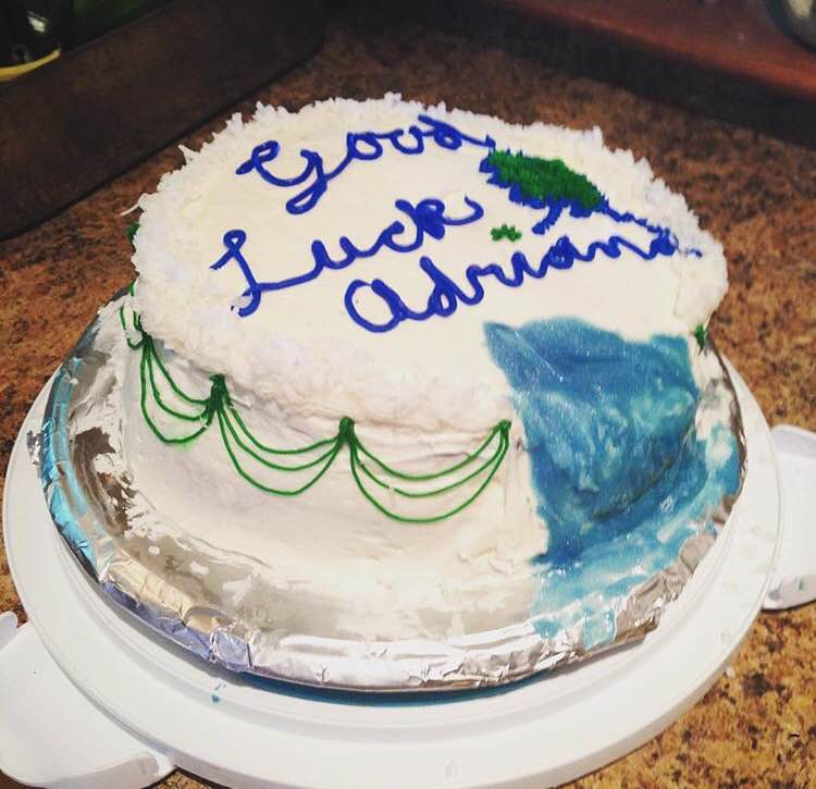 Last Thursday (wow, does that ever feel like a lifetime ago...) my parents drove me to the Syracuse airport at 9:15 am. The previous evening of family fun with the Picciano's was spent in Lafayette. I've mentioned this crazy bunch in a previous post, but they're really a great crew. First of all, it was my grandma's birthday. So we attempted the age-old Surprise-on-Curtain-Rd. This has never, in the history of Picciano birthday surprises, ever been a real surprise. Mostly because a surprise party of some sort happens every year.... we're a predictable bunch I guess. But whoever the surprisee happens to be (usually a grandparent or both) always puts on a good show of it, and we all feel accomplished in our previous not-so-secretive planning and scheming behind (or in front) of their back. Anyways, after a ridiculous amount of confusion (mostly on the part of the grandparents caused by their kids), we all had a lot of fun. Wine, pinatas, and fireworks were enjoyed by all, and all was good in the Picciano world. At the end of the evening, I was surprised with a beautiful "Alaska Cake" made by my cousins; it's a glacier! Can you see the state of Alaska?